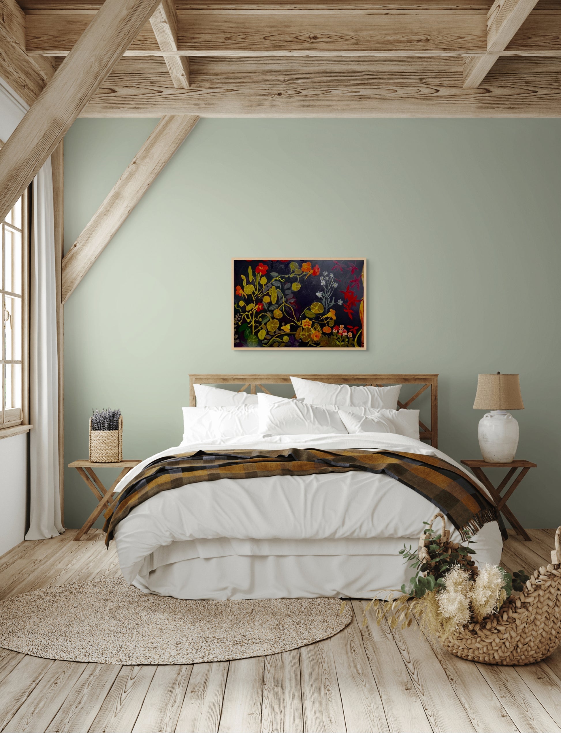 This painting grew out of sitting drawing Nasturtiums winding they're merry way through my garden and suddenly hearing a Curlew nearby, calling , singing a unique song , Michaelmas daisies and red leaves indicate adaption and transformation .